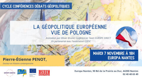 Cette conférence débat du cycle géopolitique de la Maison de l’Europe à Nantes a été conçue en partenariat avec CZESC Nantes - Pologne. Notre intervenant nous aidera à mieux comprendre les évolutions récentes de la Pologne, trois semaines après une élection importante pour le pays, au vu de son histoire et de sa situation géographique, à proximité de l'Ukraine. Avec : - Pierre-Étienne PENOT, Docteur en Histoire contemporaine Cette conférence sera animée par Olivier BRUNET, conférencier Team Europe Direct.
